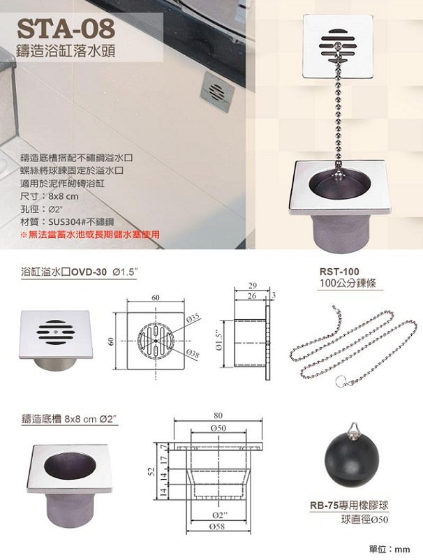 特價 STA08 砌磚浴缸落水頭(球塞式) NT$5,700 原始價格:NT$5,700。NT$2,850目前價格:NT$2,850。 型號:STA08 尺寸:8*8cm 排水孔徑:2″ 材質:304不鏽鋼 分類: 浴缸落水頭(砌磚浴缸用) 標籤: 浴室 配件 衛浴 落水頭 集水槽 排水管 STA08 砌磚浴缸落水頭(球塞式) 數量 加入購物車 描述 描述 型號:STA08 尺寸:8*8cm 排水孔徑:2″ 材質:304不鏽鋼 砌磚浴缸專用落水頭 球塞式、防蟲防臭、防髮絲雜物、快速排水 泥作砌磚浴缸用 / 不銹鋼脫蠟鑄造成型 非常厚實款 相關商品 地板排水 地板集水槽WS10**楔型鋼格柵截水槽 快速排水 查看內容 特價 地板排水 地板集水槽WS1010BK 不鏽鋼地板落水頭-黑色 NT$4,700 原始價格:NT$4,700。NT$2,350目前價格:NT$2,350。 選擇規格 此產品有多種款式。 可在產品頁面選擇選項 特價 地板排水 地板集水槽FK1010 磁磚型地板落水頭 NT$620 原始價格:NT$620。NT$315目前價格:NT$315。 選擇規格 此產品有多種款式。 可在產品頁面選擇選項